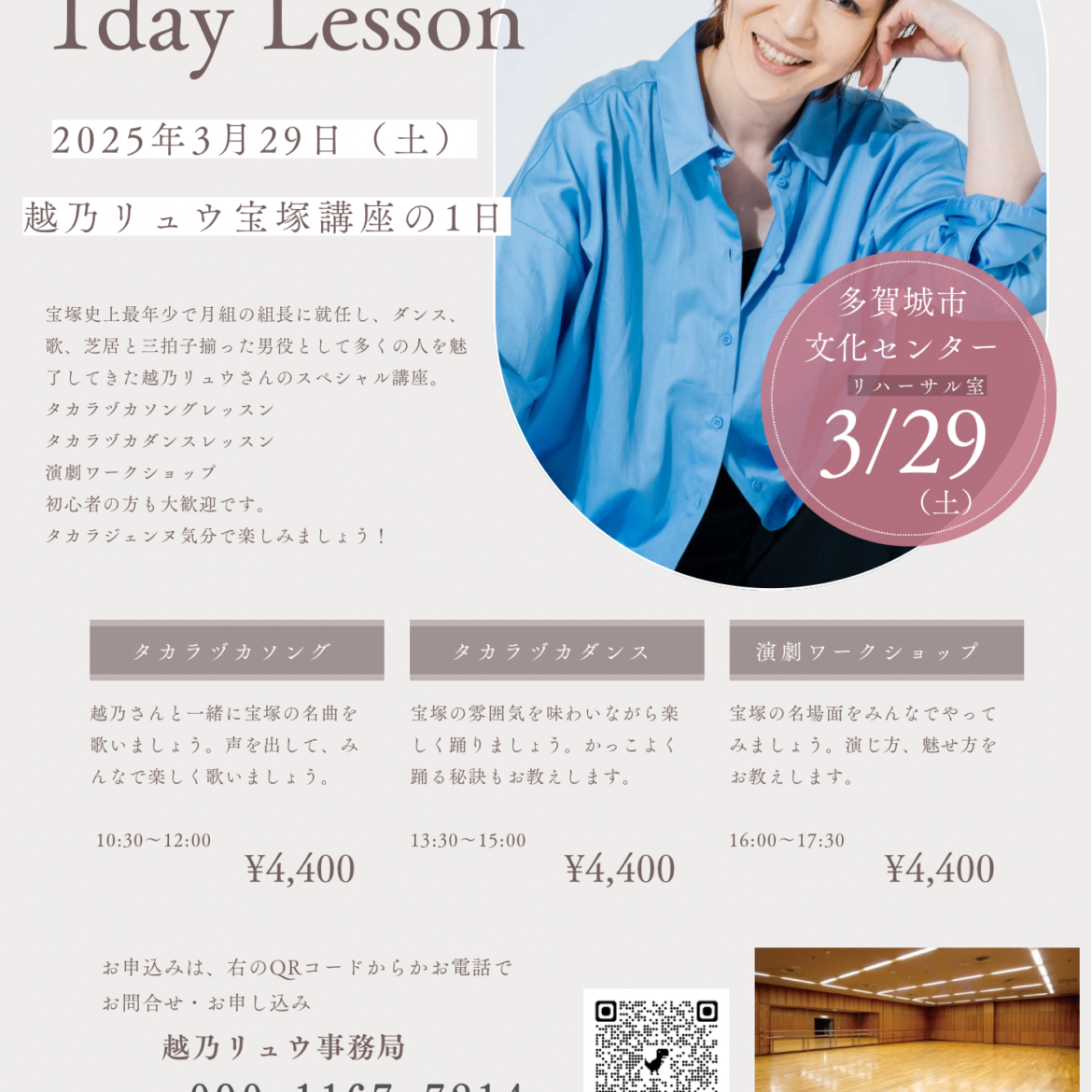 2025年3月29日 (土) 宮城県多賀城市文化センター 越乃リュウ宝塚講座の一日 タカラヅカソングレッスン 10:30~12:00 タカラヅカダンスレッスン 13:30~15:00 演劇ワークショップ 16:00~17:30 各 4,400円 (税込) 初心者の方も大歓迎です。 タカラジェンヌ気分で楽しみましょう! お申込み・お問い合わせ 越乃リュウ事務局 090-1167-7214 まで