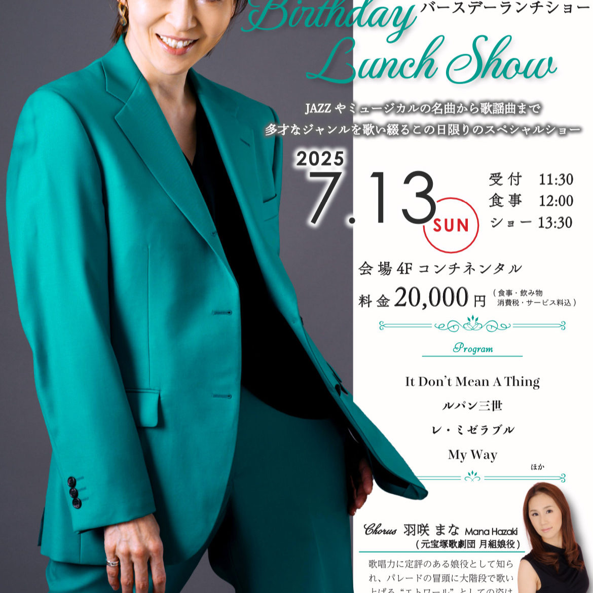 2025年10月31日(金) 20:00~22:30上演時間:約60分間(開場:19:50~,ラストオーダー:22:00) 着席34名様限定 お一人様 38,000円バーカウンター(最大5席) 33,000円 ■ミュージカル・ガラコンサート■ラッキードロー■お食事:ラグジュアリーバイツ■お飲み物:アルコール・ソフトドリンクフリーフロー付き(シャンパーニュ、赤白ワイン、ビール、ハイボール含むカクテル […]